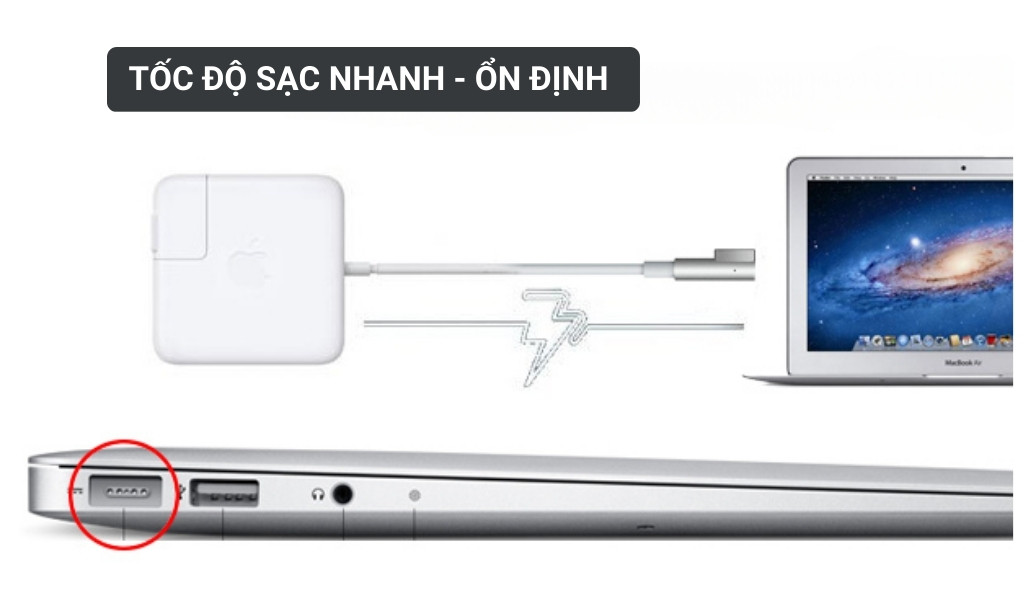 Bộ sạc MacBook Air 45W MagSafe 1 này giúp sạc lại pin lithium polymer khi hệ thống đang tắt, hoạt động, hoặc ở chế độ ngủ. Ngoài ra, bộ sạc cũng cung cấp nguồn điện cho hệ thống nếu bạn chọn hoạt động mà không có
